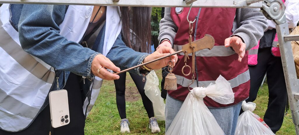 Aux stands d’Élan-Savigny Environnement et de Morsang sur Orge, nous avons distribué à chacun des gants adaptés, des sacs poubelles et des pinces pour le ramassage. Tous se sont ensuite retrouvés à l’entrée du parc côté Morsang, en bas de la rue Marcel Cachin, pour peser les sacs, qui étaient encore bien remplis cette année. Les sacs ont été déposés dans la benne fournie par le département. Comme l’an passé, nous avions mis à disposition des balances romaines. Cela a permis aux enfants de découvrir et de manipuler ces instruments de mesure anciens.